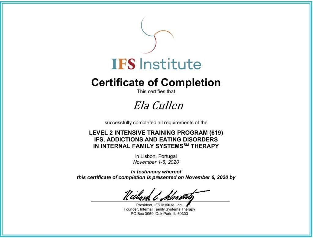 Ale nie zawsze tak było. Jako Dorosłe Dziecko Alkoholika (DDA), mała Ela bardzo długo wołała o pomoc, o zaopiekowanie i miłość. Nie miałam pojęcia co się dzieje i dlaczego się tak dzieje, że jest mi źle i że znów podejmuję niewłaściwe decyzje, których konsekwencje doprowadzają do łez i ogromnego bólu. Lata pracy nad sobą, warsztaty, kursy, książki, szkoła i w końcu treningi IFS na dwóch poziomach, doprowadziły mnie do miejsca, gdzie wszystko jest mniej więcej jasne.